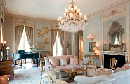 Декор играет важную роль: зеркала в тяжелых рамах, канделябры, настенные панно, классические скульптуры усиливают эффект парадности.